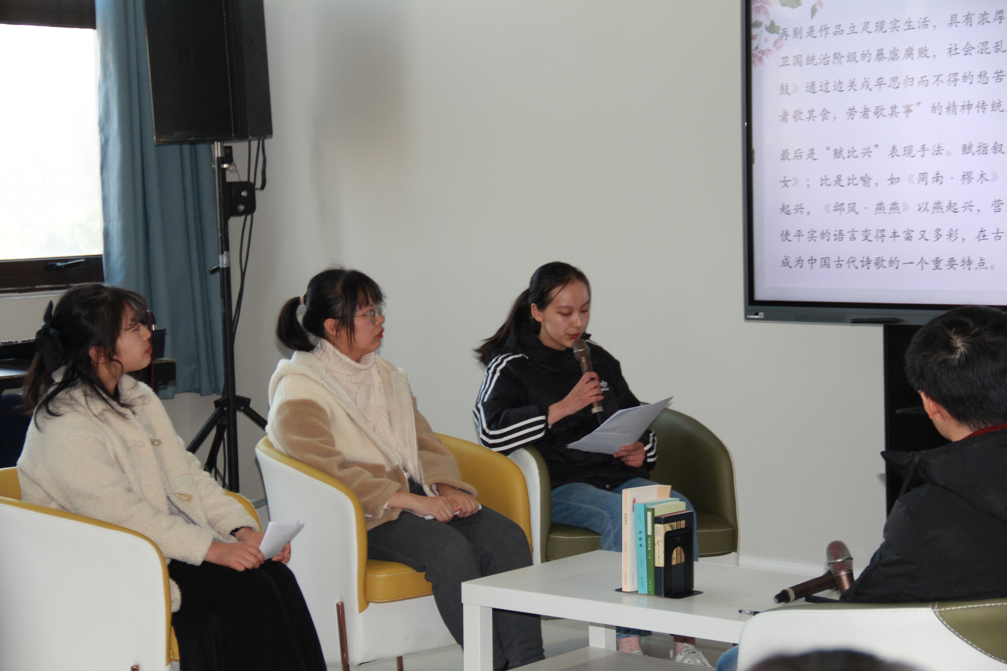 本次读书分享会的顺利举行让同学们更深入地体会到了《诗经》深厚的艺术魅力,观赏到古人丰富多彩的生活画卷,对《诗经》有了全新的理解和认知,同时也使同学们扩展了知识面,增强了读书和学习的交流能力,提升了自身修养。