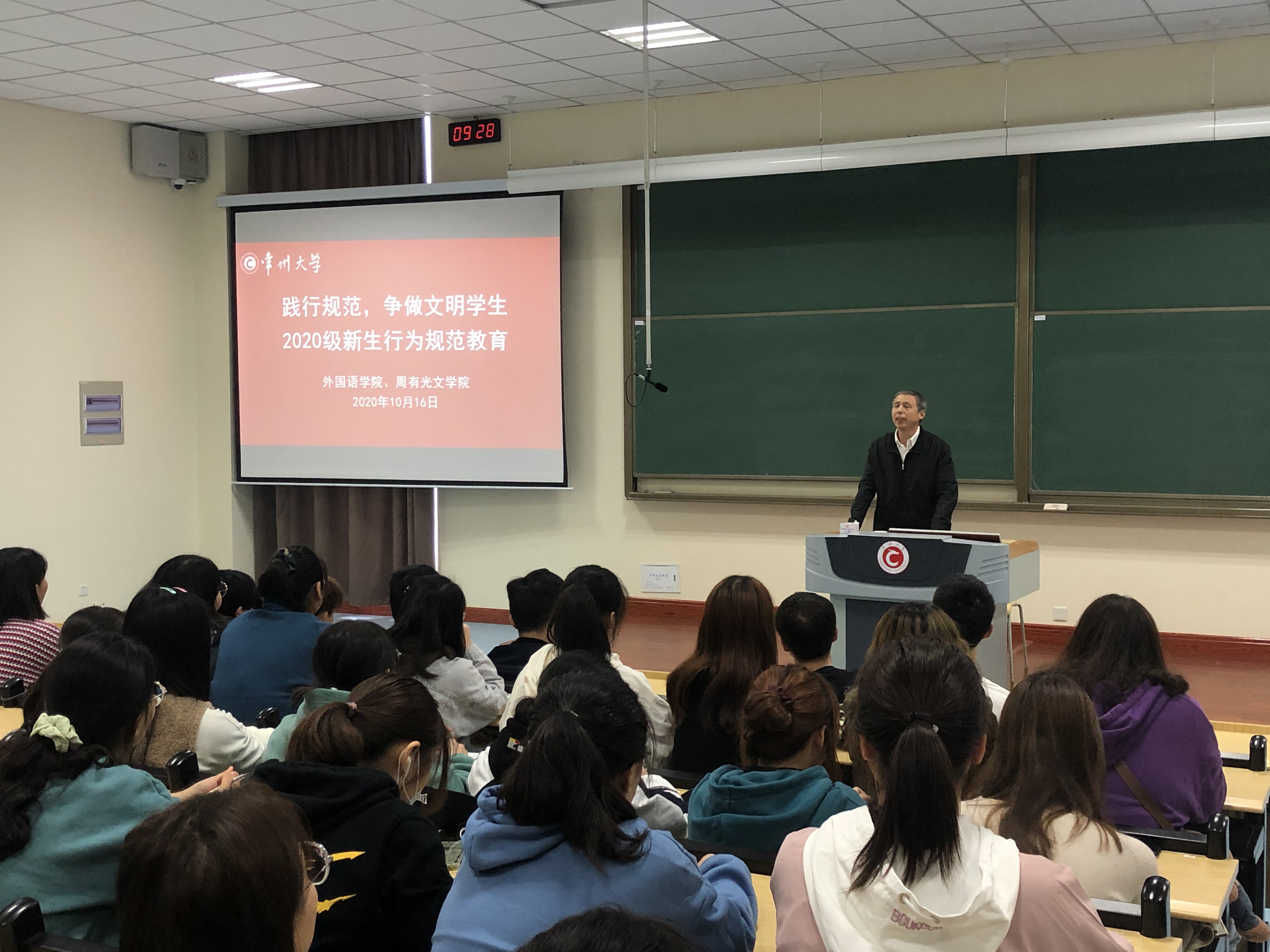 为帮助新生更好地理解学校的规章制度,养成良好的行为习惯,10月16日上午,外国语学院、88篮球直播 在教学楼X2阶开展了新生行为规范教育讲座,邀请了关工委赵新华老师、学生处黄龙老师主讲,88篮球直播 党委书记焦洁庆主持会议,2020级全体新生参加。