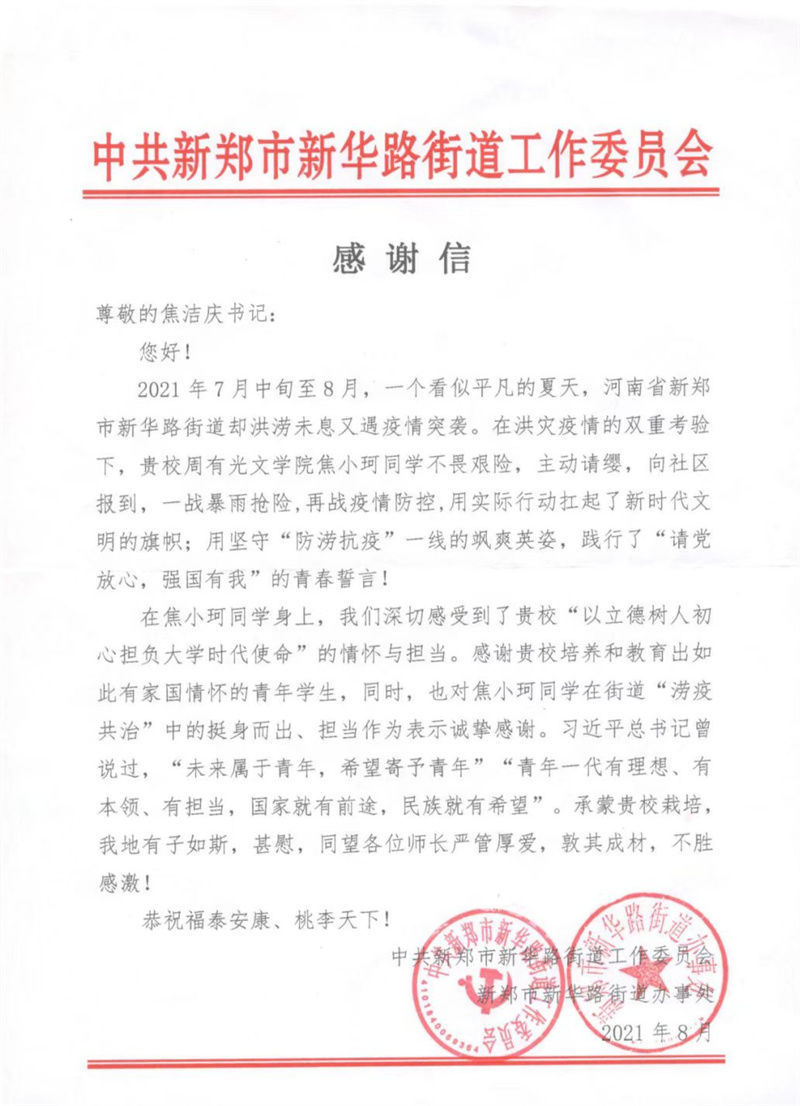 近期,中共新郑市新华路街道工作委员会向88篮球直播 发来一封感谢信,专函致谢88篮球直播-篮球直播线上看 汉语191班焦小珂同学,感谢她不畏艰险,主动请缨,用实际行动扛起了新时代文明的旗帜,用坚守“防涝抗议”一线的飒爽英姿,践行了“请党放心,强国有我”的青春誓言,同时也向常州大学培养和教育出有如此家国情怀的青年学生表示感谢。