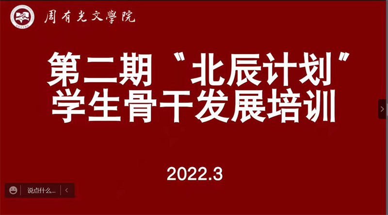 3月11日下午,88篮球直播 团委学生会于线上召开“北辰计划”学生骨干发展培训活动,培训会由学生会执行主席林嘉倩主持,周有光学院全体团委学生会成员参与此次培训。