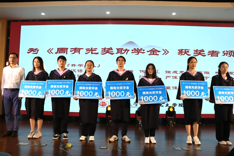 在“忆·峥嵘”篇章中,院长助理董文康老师首先宣读优秀毕业生标兵、优秀毕业生表彰决定,葛金华副院长为获奖同学颁奖;院长助理黄杭西老师宣读《周有光奖助学金》表彰决定,章卫忠部长、王荣泰社长分别为获奖同学颁奖并致辞。章卫忠部长在致辞中希望学子们要铭记“有光”精神,用精神引领未来,做国家建设栋梁。王荣泰社长首先对获奖同学表示祝贺,并以周老晚年依旧坚持学习的故事来期许广大毕业生要有终身学习的志向,学而不辍、方有大成。之后,毕业生代表依次上台,学院学位委员会全体成员为毕业生一一拨穗,为他们颁授学士学位。