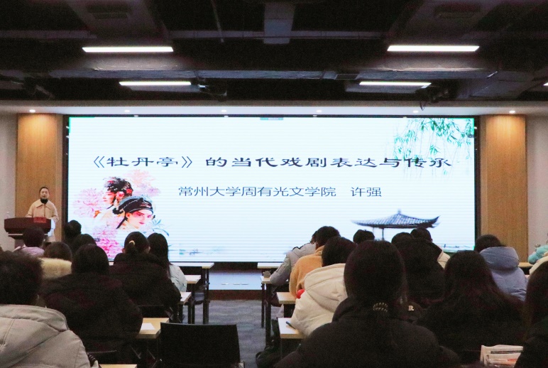 12月2日下午,篮球直播线上看 在立言楼458报告厅成功举办本学期“苔岑雅集·周有光文化大讲堂”第四讲(总第十五期),讲座以线上线下结合、面向校内外师生同步直播的方式举行。本期主讲嘉宾为篮球直播线上看 青年教师、江南文化研究中心研究员、扬州大学文学博士许强老师,讲座题目为“《牡丹亭》的当代戏剧表达与传承”。篮球直播线上看 党总支书记焦洁庆、院长葛金华、校跨文化研究院院长杜志峰出席讲座,黄杭西、吴玟瑾、王静雅等青年教师,以及校内外学者、师生近百人通过线上线下的方式参加了讲座。古代文学教研室蒋碧薇老师主持讲座。