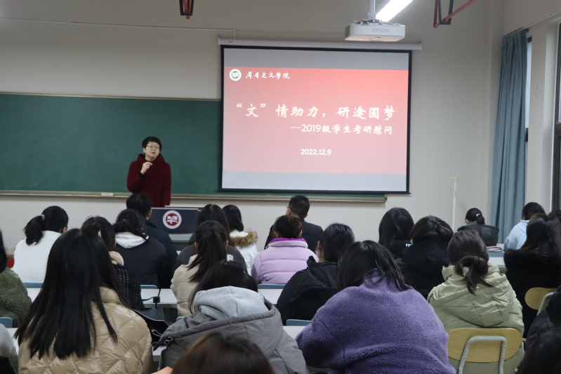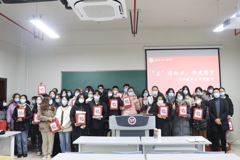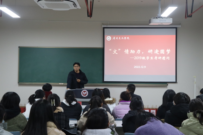 虽在冬日,情能暖心。在2023年全国硕士研究生考试来临之际,为鼓舞考研学生信心,舒缓心理压力,积极应对考试,周有光文学院于12月9日下午在立言楼342文化教室开展了“‘文’情助力,研途圆梦”2019级学生考研慰问交流活动。校心理健康教育中心教师李秋云,88篮球直播 党总支书记焦洁庆、院长葛金华出席了此次活动,活动由毕业班辅导员程向君主持。