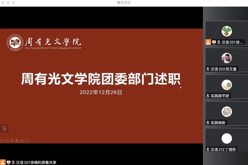 12月26日下午,88篮球直播 团委于线上召开年终述职。会议由团委副书记徐楠主持,88篮球直播 团工作负责人吕俊红、团委副书记邱艾嘉及团委全体成员出席了本次会议。