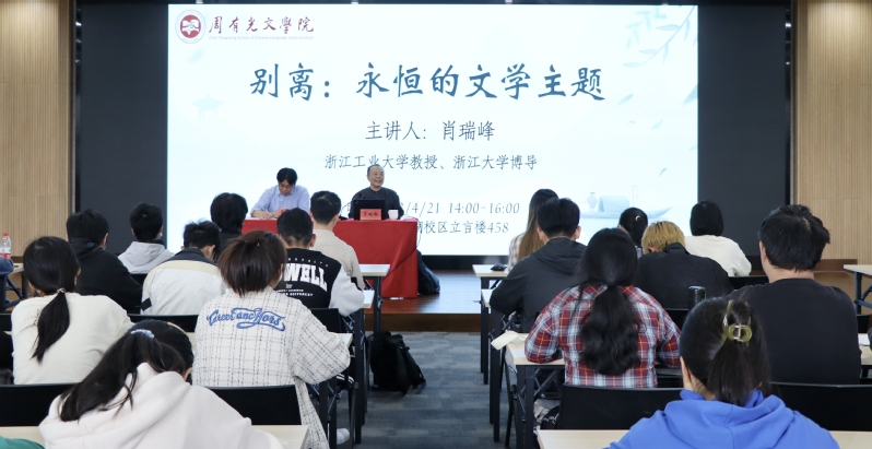 4月21日,浙江工业大学人文学院教授、浙江大学博导肖瑞峰先生应“苔岑雅集·周有光文化大讲堂”第二十三期邀请,在立言楼458为篮球直播线上看 师生作了题为“别离:永恒的文学主题”的学术讲座。院长葛金华、院长助理黄杭西、古代文学教研室沈扬、王静雅、许强等教师出席活动,校内外近两百位学者、师生共同参与。讲座由葛金华院长主持。