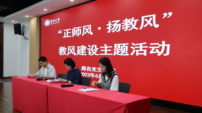 会上,葛金华院长首先带领全体教师学习了《新时代高校教师职业行为十项准则》《常州大学师德失范行为负面清单及处理办法(试行)》等文件,强调了师德师风建设在立德树人上的重要性,要求全体教师逐条对照,严格遵守和执行。他希望老师们充分重视师德师风问题,严以律己,共同营造风清气正的育人和学术氛围。