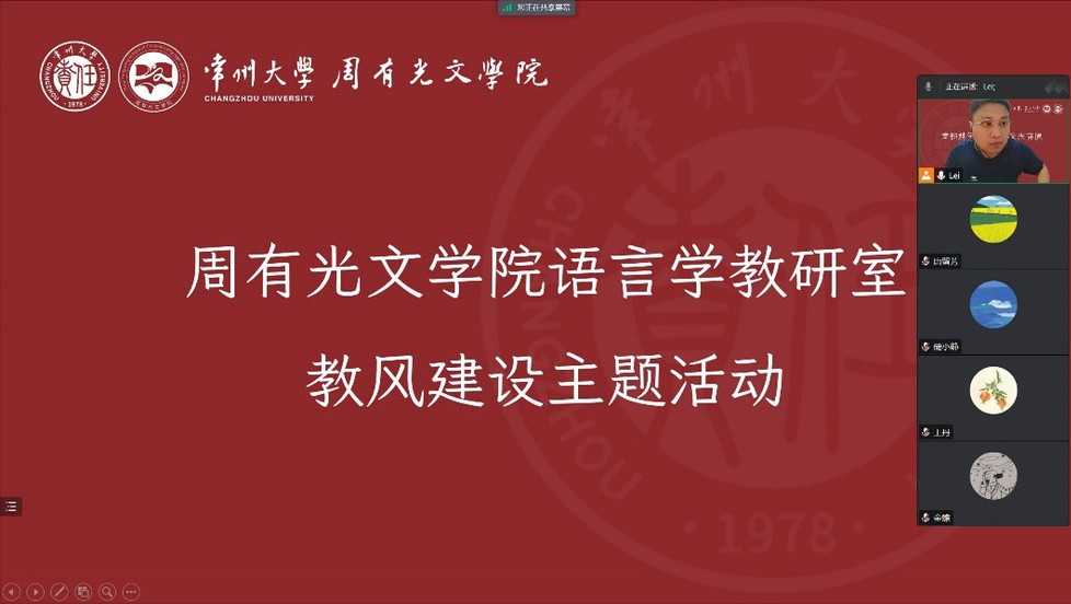 活动中,教研室主任刘磊老师首先带领语言学教研室老师们学习《常州大学教师教学工作规程》《常州大学教学资料管理规范》等文件,强调了教风建设的重要性,要求老师逐条对照、严格遵守和认真执行。