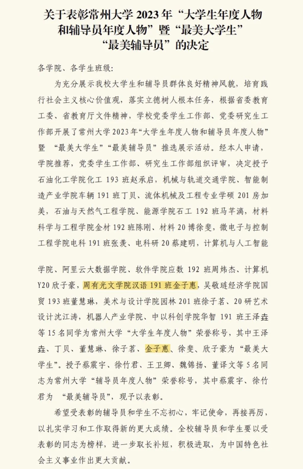 近日,学校党委学生工作部、党委研究生工作部公布了《关于表彰常州大学2023年“大学生年度人物和辅导员年度人物”暨“最美大学生”“最美辅导员”的决定》,篮球直播线上看 金子惠被授予2023年常州大学“大学生年度人物”暨“最美大学生”荣誉称号。