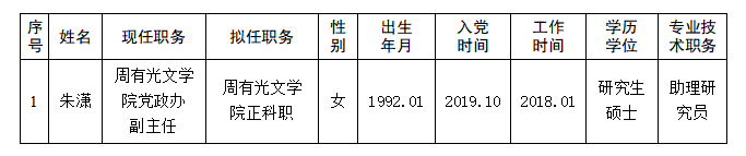 经学院研究,并报请校党委常委会通过,拟对朱潇同志提拔任职,现予以公示(见下表)。
