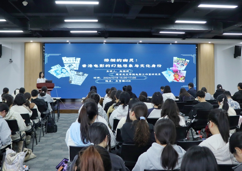 4月19日,篮球直播线上看 在立言楼458报告厅成功举办“苔岑雅集·周有光文化大讲堂”第四十讲。本期主讲嘉宾为篮球直播线上看 电影工作室主任赵雅婷老师,讲座题目为“徘徊的幽灵:香港电影的幻魅想象与文化身份”。篮球直播线上看 党总支书记焦洁庆、院长葛金华、院长助理黄杭西,校内外学者、师生近两百人参加讲座。文艺学与世界文学教研室张登峰老师主持讲座。