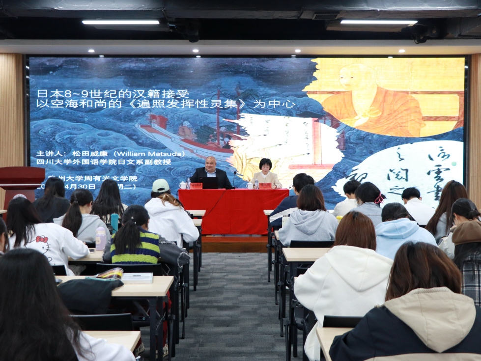 4月30日,美国夏威夷大学文学博士、四川大学外国语学院特聘研究员松田威廉应篮球直播线上看 “苔岑雅集·周有光文化大讲堂”第四十二期邀请,在立言楼458为篮球直播线上看 师生作了题为“日本8-9世纪的汉籍接受——以空海和尚的《遍照发挥性灵集》为中心”的学术讲座。院长葛金华、古代文学教研室及语言学教研室相关教师、校内外近两百名师生参加讲座。古代文学教研室薛欣欣老师主持讲座。