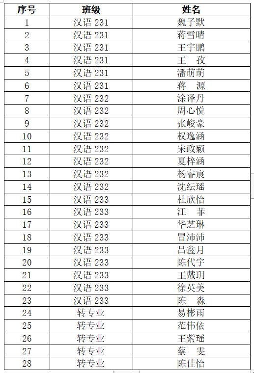 为了进一步加强学院教学改革,落实省一流专业、省特色专业建设点相关要求,学院拟开设“有光”创意写作班。经学生自愿报名,学院初步审核、综合考试,相关招录工作已全部结束。现将2023级“有光”创意写作班拟录取名单公示如下: