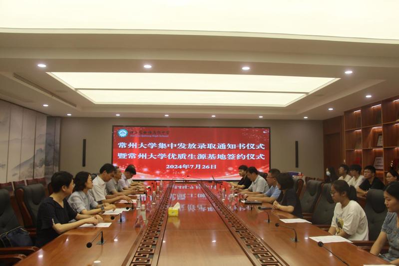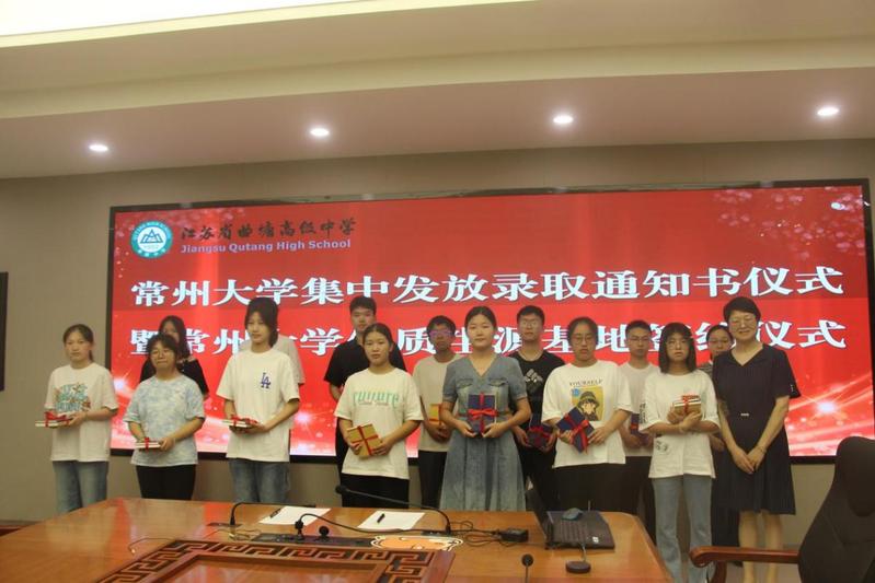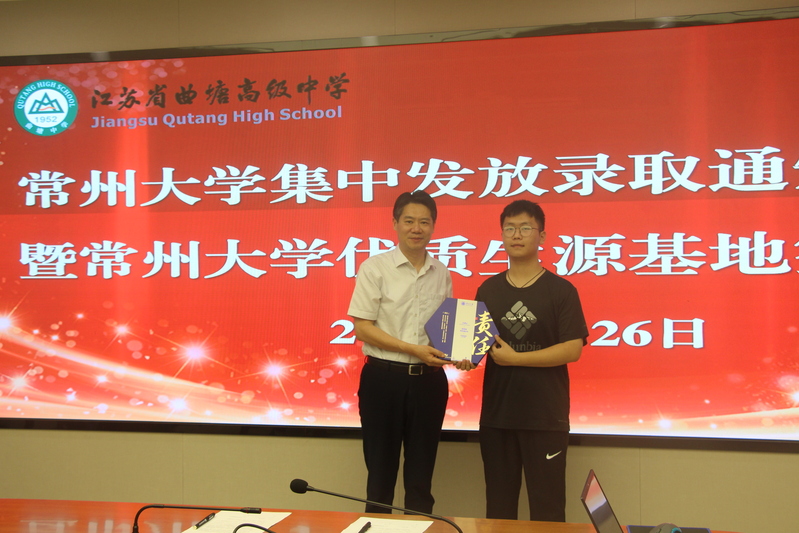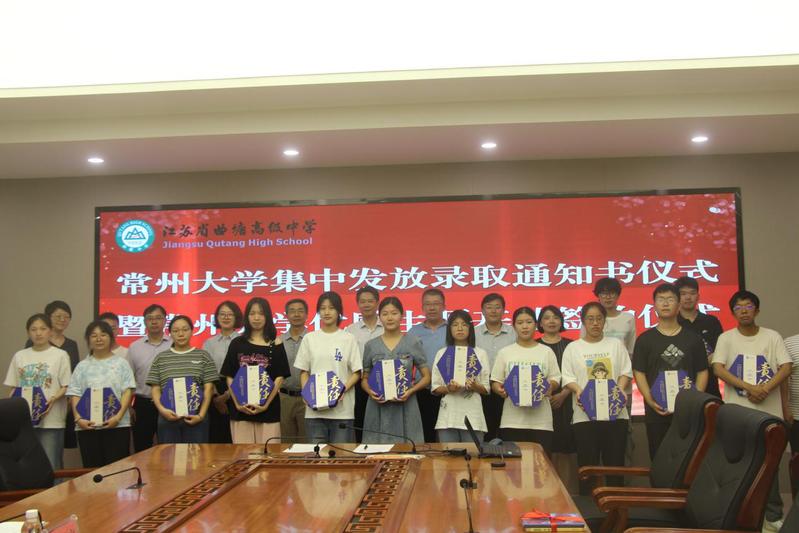 陈海群一行来到江苏省曲塘高级中学。他代表常州大学向被录取新生表达了祝贺与欢迎,并介绍了常州大学的办学特色、师资力量、科学研究、校园文化等方面的情况。陈海群鼓励学子们要珍惜大学时光,求真务实,锐意进取,努力成长为德智体美劳全面发展的社会主义建设者和接班人。曲塘高级中学副校长周强,校务委员毛兆荣、朱圣芳,被录取新生和部分家长参加了颁发仪式。