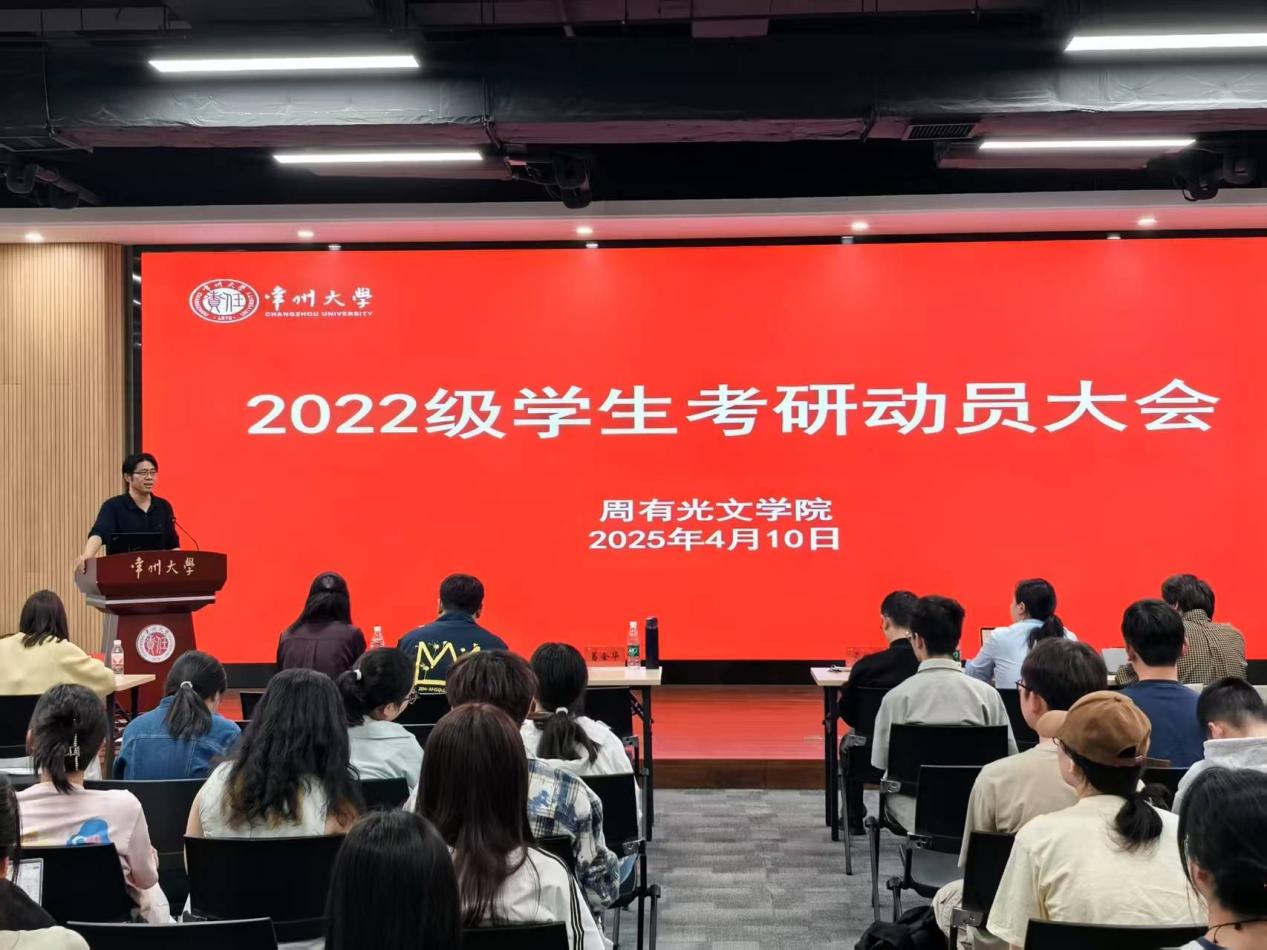 4月10日晚,88篮球直播 于立言楼458会议室举办2022级学生考研动员大会。院长葛金华、院长助理、文艺学与外国文学教研室主任黄杭西、古代文学教研室主任王风丽、现当代文学教研室主任何霞、语言学教研室主任刘磊、考研学生代表张冉冉、张梦婷、钟昕雨、徐陆延以及全体2022级学生参加会议。会议由院学工办主任张燕红主持。