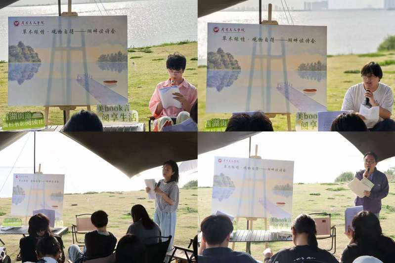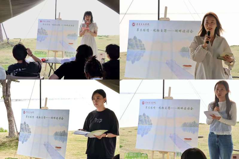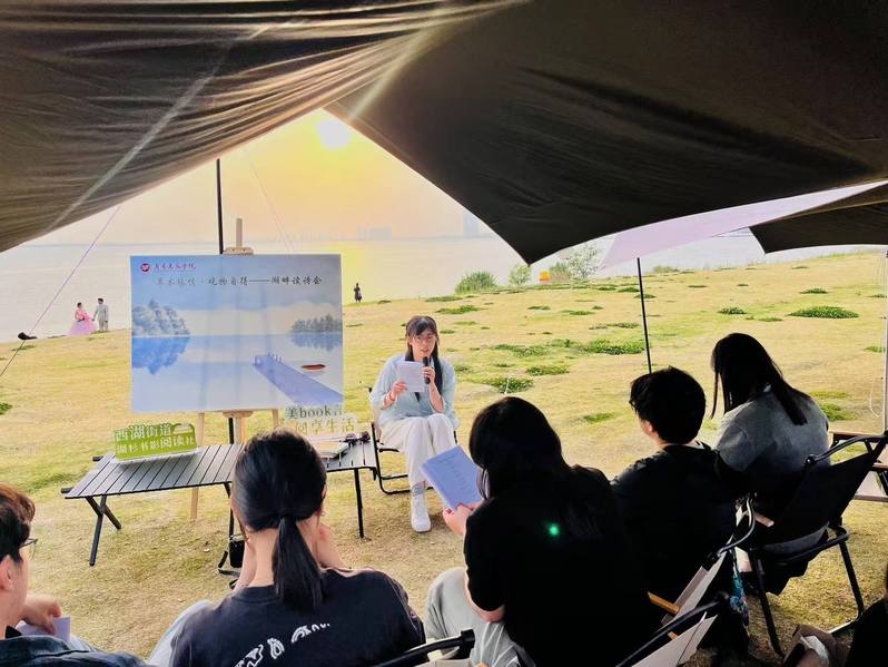 5月7日下午,由88篮球直播 与武进区西湖街道联合主办的“草木缘情·观物自得——湖畔读诗会”在西太湖国际露营岛诗意启幕。西湖街道党工委委员周婷、88篮球直播 党总支书记焦洁庆、中文系主任贺与诤和雅確书屋负责人赵雅婷参加活动,文艺学与外国文学教研室教师朱明明、古代文学教研室教师孙慧琦应邀担任分享嘉宾。西湖街道阅读社、有光文学社及雅確书屋读书会成员围坐湖畔,共同感受跨越时空的诗意。活动由汉语241班俞玥同学主持。