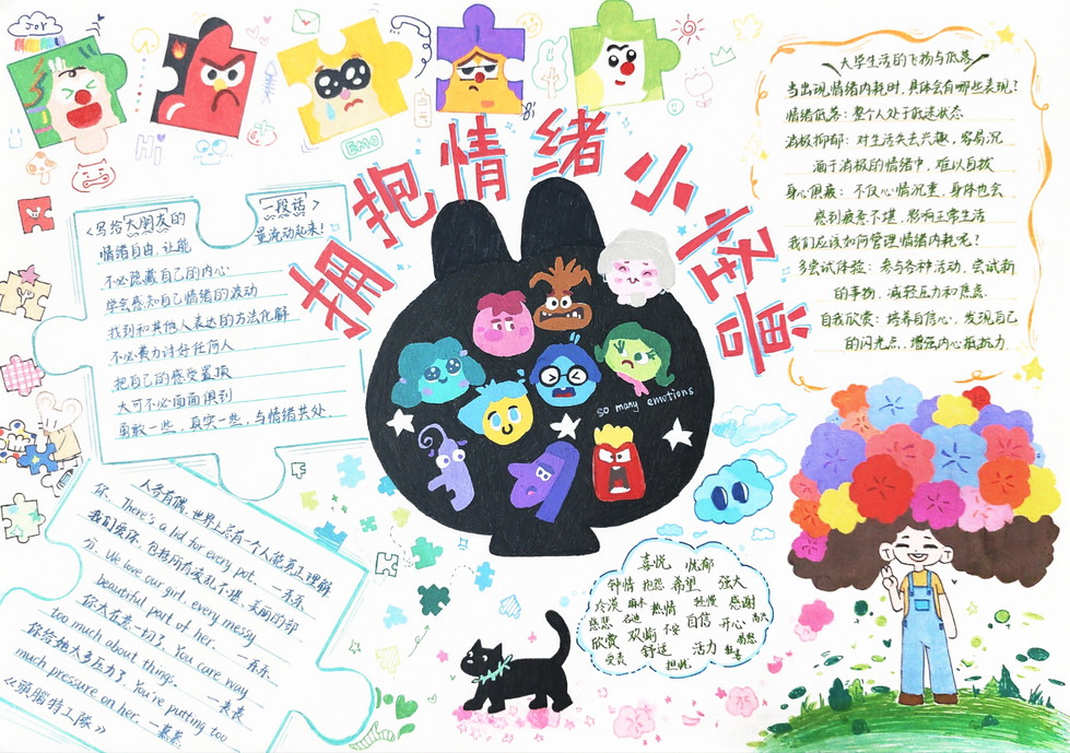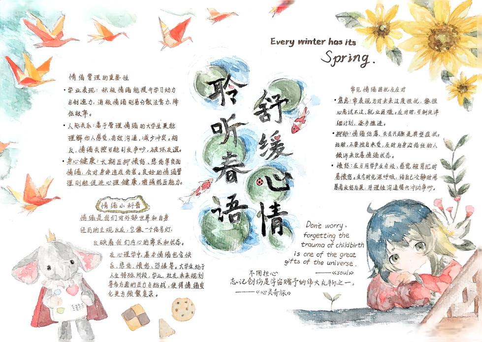 本次活动以“聆听春语,舒缓情绪”为主题。参赛同学采用绘制手抄报的方式,围绕“大学生情绪管理”、“情绪产生的机制”、“分享情绪调节技巧”等相关内容,展现自己对情绪管理的认知与思考,多维度呈现情绪管理的科学知识与实用方法,传递积极应对情绪、呵护心理健康的理念。