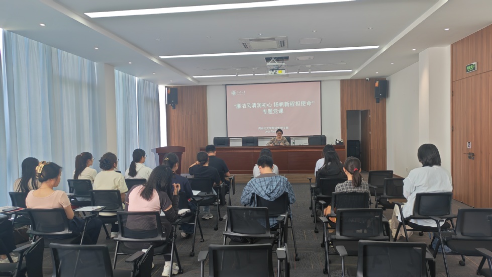 焦洁庆以“廉洁风清润初心 扬帆新程担使命”为主题向在场师生讲授党课。她围绕习近平总书记关于加强党的作风建设重要论述和中央八项规定精神,引导毕业生党员强化党性修养、端正工作作风、发挥表率作用,以廉洁自律的态度系好人生“第一粒扣子”,迈好走向社会的第一步。列举个别典型反面示例,提醒在场党员要时刻铭记党员身份,不断增强自身的纪律性、理论性和政治性,做有担当、有信仰、有目标的好党员。她特别指出,全体党员需时刻严守纪律底线,厚植奉献精神,充分发挥党员的先锋模范作用。