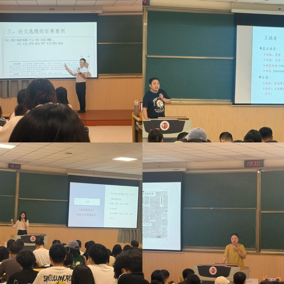 会上,各位教研室主任介绍各教研室研究方向论文写作方法。黄杭西鼓励大家以兴趣为导向,将小题大做与宏大叙述相结合,以具体问题探察文本症候,做到理论工具与文本语境相匹配。刘磊分享了文献调研的方法,并就摘要写作进行具体阐述,着重强调语体正确的重要性,指出AI能发挥的是辅助而非主导作用。王风丽重点解析了综述的写作目的与方法,希望大家充分了解现有研究,更好地把握选题核心要点。何霞探讨了文学批评与文学鉴赏的区别,并结合论文案例讲述了论文论证、利用口述史呈现地方性知识与文献的方法。