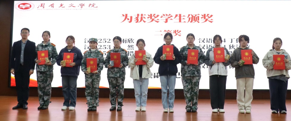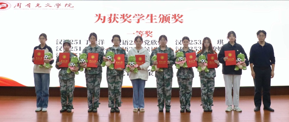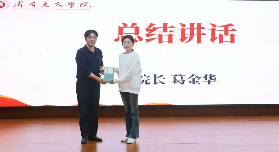会上,为在首届“有光”征文大赛中脱颖而出的优秀学子进行了表彰。本次大赛2025 年新生全员参加比赛,共评选出奖项 66 名,其中一等奖19名、二等奖10 名、三等奖37名。在激昂的乐曲和全场热烈的掌声中,老师们为获奖同学颁发了荣誉证书,并赠送了常州城市文创精美礼品。获奖代表汉语254班仓若研同学分享了她从其他专业转入篮球直播线上看 汉语言文学的心路历程,她表示汉语言文学专业最打动她的是文字与心灵的共鸣。葛金华向仓若研赠送了《文选译注》。